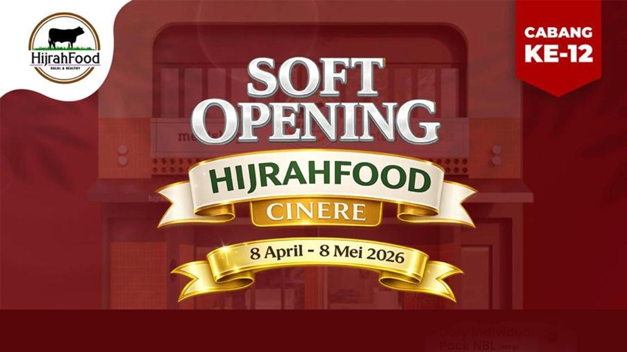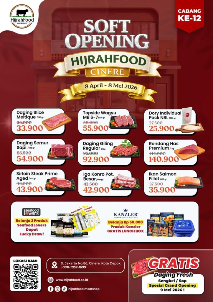 Kabar bahagia untuk para pecinta daging premium! Hijrahfood resmi membuka cabang ke-12 di wilayah Cinere, Depok, dan menghadirkan promo spesial dalam rangka Soft Opening Hijrahfood Meatshop Cinere yang berlangsung mulai 8 April hingga 8 Mei 2026.